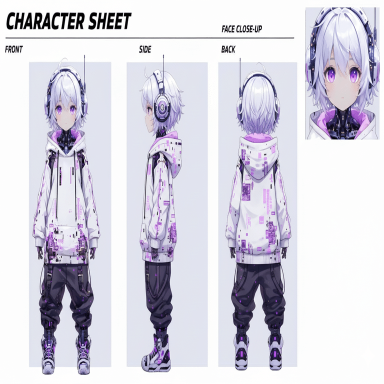 こちらのキャラクターシートは、Nano Bananaで作りました。